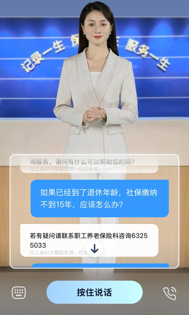 与之类似,记者使用某区社保局推出的网络互动“数字人”,向其咨询“已经到了退休年龄,社保缴纳不满15年应该怎么办?”对于这一基础问题,对方也是无法作答,只能给出职工养老保险科的电话,请提问者致电咨询。