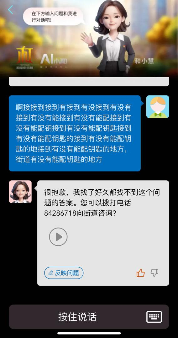很显然,用户可以根据自己想要获取的信息,点击不同的人物进行咨询。然而记者点击女性角色,使用语音功能尝试提问,“街道有没有能配钥匙的地方?”发现该平台语音转文字的识别能力堪忧,一句如此简短、清晰的提问,却被识别为“啊接接到接到有接到有没接到有没有……”重复冗余、近百字的表达。