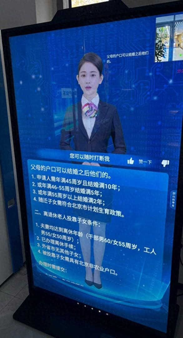 下午一时许,某街道政务服务中心正处于午休时段,但大厅侧面的24小时自助办理区仍向公众开放。步入期间,记者见到这里摆放着几台形态各异的机器,最醒目的是一块一人高的电子大屏,上面显示着一位身穿制服、面带微笑的女性工作人员形象。据此前报道,“她”是全市首个街镇级大厅“AI资讯通数字人”,可快速准确回答办事企业、群众的各类问题。