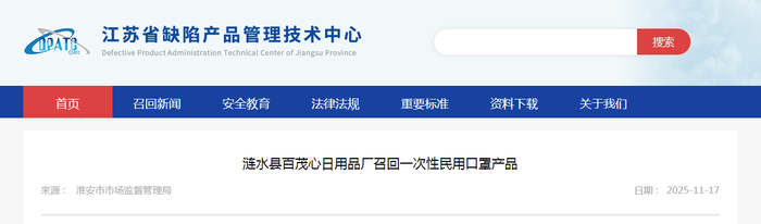 【江苏】涟水县百茂心日用品厂召回一次性民用口罩产品