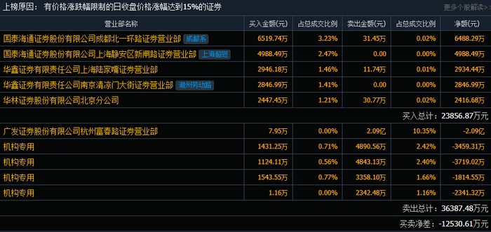 国联水产今日涨20.09% 有4家机构专用席位净卖出1.13亿元
