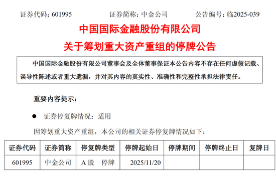 中金公司公告称,公司A股股票将于2025年11月20日(星期四)开市时起开始停牌。本次重组涉及到A+H股两地上市公司同时吸收合并两家A股上市公司,涉及事项较多、流程较为复杂,根据上海证券交易所的相关规定,预计停牌时间不超过25个交易日。
