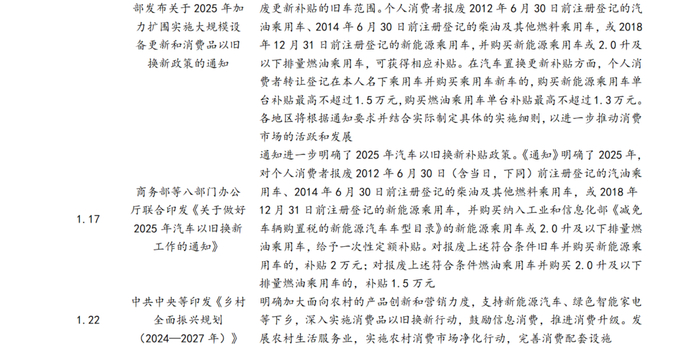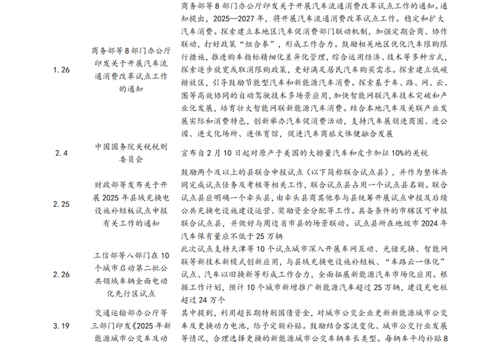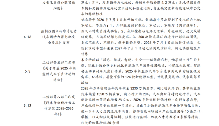 宏观政策方面,我国持续鼓励新能源汽车行业发展。2024年12月,财政部进一步明确新能源汽车政府采购比例;2025年1月,国家发改委等发布关于2025年加力扩围实施大规模设备更新和消费品依旧换新政策的通知,对符合要求的新能源乘用车最高补贴不超过1.5万元。2025年2月,工信部等八部门在10个城市启动第二批公共领域车辆全面电动化先行区试点,预计10个城市新增推广新能源汽车超过25万辆,建设充电桩超过24万个。4月,强制性国家标准《电动汽车用动力蓄电池安全要求》发布,该标准中多次提到了要求动力电池不起火、不爆炸,将于2026年7月1日起开始实施。6月3日,工信部等五部门发布2025年新能源汽车下乡活动的通知,此次活动以“绿色、低碳、智能、安全—赋能新农村,畅享新出行”为主题,合计123款新能源车型,为近6年数量最多,预计将带动400万辆销量。