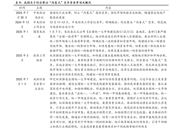 针对“内卷式”竞争,我国宏观政策“组合拳”精准发力。2024年7月,中央政治局会议首次提出要强化行业自律,防止“内卷式”竞争。2024年12月12日,中央经济工作会议明确要求综合整治“内卷式”竞争,规范地方政府和企业行为。2025年以来,反“内卷”政策持续强化,国家发改委、工信部等多部门主动作为、综合施策,推动“内卷式”竞争治理走向深入,旨在打通市场准入退出、要素配置等制约经济循环的卡点、堵点,加速推进全国统一大市场建设。1月国家发改委印发了《全国统一大市场建设指引(试行)》,明确各地不得违规实施财政、税费、土地、价格、资源、环境等方面的招商优惠政策;7月1日,中央财经委员会第六次会议召开,研究纵深推进全国统一大市场建设、海洋经济高质量发展等问题。其中,纵深推进全国统一大市场建设,基本要求是“五统一、一开放”。10月28日,十五五规划建议中进一步系统明确统一大市场的具体内容,后续预计将出台系列相关配套政策。