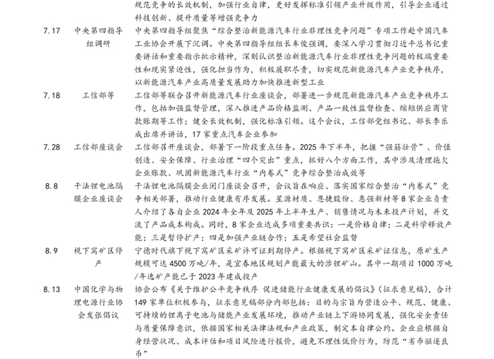 在宏观系列顶层政策设计上,国务院、工信部等相继公布系列政策,行业协会发布倡议,相关企业纷纷响应。其中,国务院2025年3月公布的《保障中小企业款项支付条例》明确大型企业采购货物、服务交付之日起60日内支付款项。7月16日,国务院常务会议听取规范新能源汽车产业竞争秩序情况的汇报,会议指出要着眼于推动新能源汽车产业高质量发展,针对该产业领域出现的各种非理性竞争现象,坚持远近结合、综合施策,切实规范新能源汽车产业竞争秩序。中汽协、中国化学与物理电源行业协会等纷纷发出倡议,相关企业积极响应,如6月中国一汽等17家重点车企积极响应并作出“供应商支付账期不超过60天”的公开承诺。