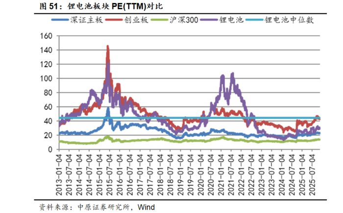 根据万得数据统计:2021年锂电池和创业板估值均值分别为85.20倍和51.10倍,且锂电池板块估值见顶后总体持续回落;2022年均值分别为43.34倍和39.47倍倍;2023年均值分别为19.14倍和34.74倍;2024年均值分别为19.64倍和30.32倍。截至2025年11月18日:锂电池和创业板估值分别为28.69倍和42.32倍。2022年以来,目前锂电池板块估值显著低于2013年以来44.06倍的行业中位数水平。基于行业政策、新能源汽车行业发展前景、锂电池板块业绩增长预期及估值水平,维持锂电池行业“强于大市”投资评级。