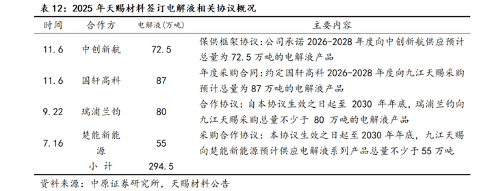 2025年7月以来,天赐材料与部分电池企业签署电解液产品供应总量合计约294.5万吨,供应期限从协议签署日到2030年不等。电解液采购协议的签署,一方面为了确保电池企业未来的供应链稳定,特别是六氟磷酸锂的稳定供应,同时侧面反馈锂电池行业需求。2025年前三季度,我国电解液出货141万吨,同比增长40%,其中第三季度出货54万吨。