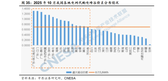 一方面储能电池价格持续下降,同时我国部分地区峰谷电价差价较高。具体而言:2025年10月,15个省市峰谷价差超0.7元/kWh,其中7个省市峰谷价差超1元;10月多地不再执行迎峰度夏期间的尖峰深谷电价,还在执行尖峰电价的有广东、山东、冀北、河北南、湖北5个地区,仅山东、浙江、江西执行深谷电价。从最大峰谷价差及用户侧储能充放电次数(可达到每年600次以上)来看,广东用户侧储能仍存在较大的套利空间,未来仍可能成为用户侧储能的重要市场。