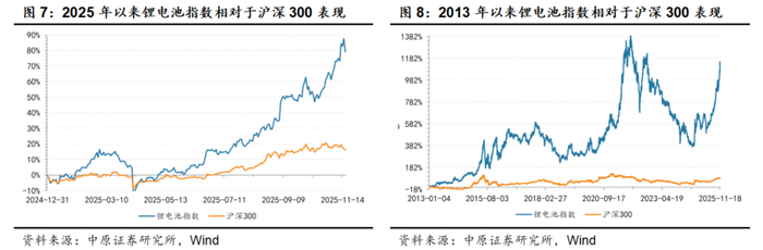 根据万得数据统计:2013年以来,锂电池板块最高涨幅约14倍,于2021年11月底见顶。2025年以来,锂电池指数走势总体与沪深300趋同,但全年走势总体强于沪深300指数,其中9月以来显著上涨。截至11月18日:锂电池板块指数上涨79.34%,而同期沪深300指数上涨16.09%,锂电池指数跑赢沪深300指数63.25个百分点;个股方面,2025年以来,锂电池板块中上涨个股102只,下跌个股2只,个股涨幅中位数为61.03%。板块跑赢主要指数主要系板块业绩恢复增长,新能源汽车销售增长带动动力电池持续增长,储能电池需求超预期,以及锂电产业部分细分领域价格快速上涨。
