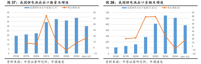海关统计数据显示:2024年我国锂电池出口39.14亿个,同比增长8.09%;出口金额611.21亿美元,同比下降5.97%,主要系行业价格下降,其中美国出口金额153.15亿美元,同比增长13%,占比25.06%,是最大单一市场。2025年1-8月,我国锂离子电池出口数量为30.03亿个,同比增长18.66%;出口金额482.96亿美元,同比增长25.79%,其中德国出口金额占比18.9%为第一大出口市场,美国出口金额同比下降7.69%,占比16.8%,出口金额位居第二。根据彭博新能源财经数据显示:2025 年1-7月,中国电网级锂离子电池约占美国进口总量的65%,出口管制如实施预计将影响此类电池。能源需求是美国人工智能数据中心基础实施的制约因素,电池储能系统对于数据中心能源稳定意义重大,数据中心电力成本占运营成本超过50%,彭博预计未来十年美国全国将新增高达136吉瓦的电池容量。