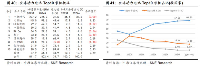 动力电池领域,我国动力电池企业优势显著且市占率持续提升。韩国SNE Research统计显示:2020年以来,Top 10动力电池企业中中国入围6家、韩国3家、日本1家,其中中国入围企业合计市场占比总体持续提升,如2020年占比38.35%,2024年合计占比67.08%,2025年1-9月占比68.20%,较2024年同期提升2.68个百分点。2025年1-10月,韩国3家企业占比16.90%,日本1家企业占比4.07%,韩国和日本分别较2024年同期回落3.27和回落0.10个百分点。同时,我国动力电池企业加速全球化布局,2025年6月3日,远景动力位于法国杜埃的电池超级工厂正式投产,该工厂首期10GWh产能的投产,每年将为20万辆电动汽车提供高品质的动力电池,将助力欧洲加速低碳转型。