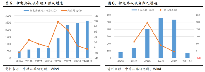 板块在建工程显示: 2024年上半年,板块在建工程为2834.10亿元,为近年来的最高值;2024年为2333.91亿元,同比下降6.06%。2025年前三季度,板块在建工程增至2726.98亿元,同比增长3.15%,环比上半年增长6.76%,显示行业产能仍处于扩张中,板块个股在建工程数据显示:2025年前三季度在建工程环比上半年增加的主要集中于行业龙头,其中比亚迪增加131.83亿元、国轩高科增加31.79亿元、华友钴业增加26.93亿元。