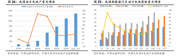 根据中国汽车动力电池产业创新联盟数据统计:伴随我国新能源汽车高增长及锂电产业链总体竞争格局,我国动力电池产量和新能源汽车动力电池装机量持续增长。2024年,我国动力和其他电池合计产量1096.80GWh,同比增长40.96%。2025年1-10月,我国动力和其他电池合计产量1292.50GWh,同比增长51.30%,增速较2024年提升。