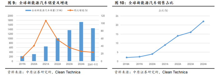 根据Clean Technica统计数据:2024年,全球新能源汽车销售1724.16万辆,同比增长25.98%,占整体市场22%份额,占比同比提升6个百分点。全球新能源汽车高增长,主要受益于中国新能源汽车市场增长。