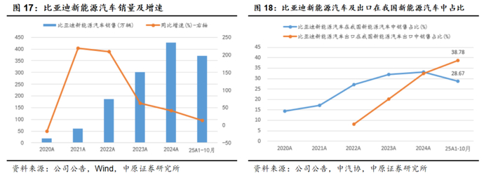 我国新能源汽车出口在2020-2023年持续高增长,其中2023年出口120.30万辆,同比增长77.17%;2024年出口128.4万辆,同比增长6.73%,增速回落主要受欧洲等贸易保护影响;2025年1-10月出口201.4万辆,同比增长90.4%,主要受益于比亚迪出口高增长。