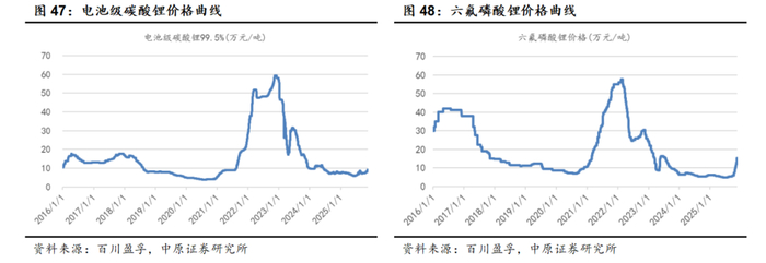 板块业绩将持续增长。我国锂电池全球竞争优势显著,动力电池全球Top10中我国入围6家企业市场占比68.2%,储能占比超90%。产业链价格总体稳中有升,其中钴相关产品、电解液细分领域价格短期快速上涨,碳酸锂等价格已触底,总体预计2026年锂电产业主要材料均价较2025年稳中有升。结合行业需求,2025年板块业绩将恢复增长,预计2026年业绩将持续保持两位数增长,但细分领域个股业绩将分化。