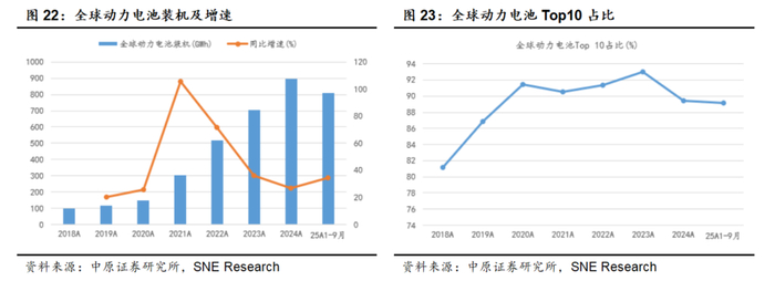 行业集中度方面总体较高,2018年全球动力电池Top10企业装机占比81.2%,2023年提升至92.98%且为近年来的最高值;2025年1-9月回落至89.17%,仍维持在较高水平。考虑动力电池行业属于典型的资金和技术密集型行业,预计产业集中度总体将维持在90%左右。