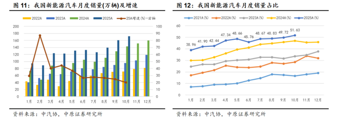 综合新能源汽车行业发展驱动力已过渡至强产品和市场驱动,我国新能源汽车产业供应链优势显著,国家和地方以旧换新政策持续鼓励新能源汽车消费,充电基础设施总体稳步向好,预计2025年我国新能源汽车销售约1640万辆,同比增长27.54%,占比约48.50%,同时预计我国新能源汽车出口销售增速将显著高于国内增速;2026年我国新能源汽车销售约1810万辆,同比增长10.40%,占比约51%。