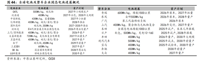 从电池和整车企业布局来看,固态电池行业已形成明确的时间推进蓝图,为产业链各环节提供了明确的目标导向。在电池企业端,宁德时代、中创新航、亿纬锂能等头部厂商均将2027年定为全固态电池小批量装车的关键节点,目前已同步推进中试线产能爬坡与车规级样品验证。后续重点关注电池、整车企业相关技术进展,以及工信部2024年启动的固态电池重大研发专项中期审查进展。2025年11月11日,工信部发布《关于进一步加快制造业中试平台体系化布局和高水平建设的通知》,明确将固态电池及其关键材料技术列为重点方向,核心目标:解决固态电池从实验室到工厂的转化难题,如固态电解质稳定制备;联合上下游资源,形成从材料到电芯的完整中试能力;同时加速商业化,通过测试验证和工艺改进缩短研发周期,推动2027年前实现技术产业化。