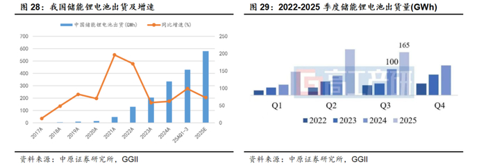 高工产研统计显示:2024年全球储能锂电池出货340GWh,同比增长51.1%;其中中国储能锂电池出货335GWh,同比增长62.62%。2025年前三季度,我国储能锂电池合计出货430GWh,同比增长99.07%,电力储能和户用储能出货量分别为365GWh和33GWh。其中,2025年第三季度出货165GWh,同比增长65%,细分领域看:电力储能/户用储能/工商业储能/通信(含数据中心)&便携式储能锂电池出货量分别为130GWh、15GWh、10GWh、10GWh。GGII预计2025年第四季度行业仍保持供不应求态势,全年总出货量达580GWh,增速超过75%。