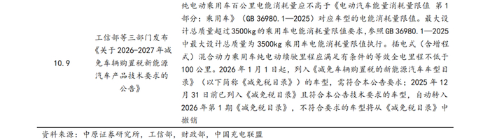 值得关注的是,2023年财政部等发文将新能源车车辆购置税减免政策划分为两个阶段:购置日期在2024年1月1日至2025年12月31日期间的,免征车辆购置税,其中每辆车免税额不超过3万元;购置日期在2026年1月1日至2027年12月31日期间的,减半征收车辆购置税,其中每辆车减税额不超过1.5万元。2025年10月9日,工信部发布的《关于2026-2027年减免车辆购置税新能源汽车产品技术要求的公告》显著提升了购置税减免的新能源汽车技术门槛,对车辆能耗和续航提出了更高要求:插混乘用车从现在的43公里提升到100公里。调整视为我国新能源汽车政策从“驱动规模”转向“驱动技术标准”,新规将促进电池容量、混动系统等技术升级,提升产品安全性与竞争力;助推企业推出更高性能车型,满足消费者对长续航、低能耗需求,助力产业绿色低碳发展,实现产业升级与消费升级。