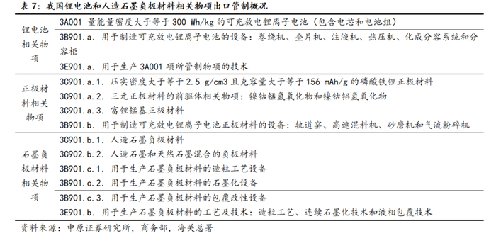 技术而言,能量密度300Wh/kg是目前高镍、半固态电池等先进技术的分水岭,主要用于军用无人机、潜航装备等特殊领域。而现阶段市场主流液态电池(能量密度约260Wh/kg)则不再管制范围内。管制后续如实施,高能量密度锂电池、高端正极材料等出口受限,将直接影响欧美车企的高端电动车产能,可能导致部分车型交付周期延长,后续积极关注管制是否恢复及其影响。