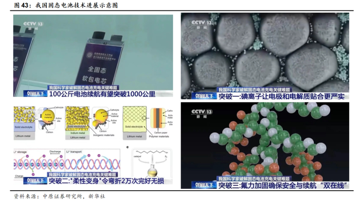 我国固态电池研究取得新突破,根据新华社报道显示:我国成功攻克全固态金属锂电池“卡脖子”难关,100公斤电池以前最多支持500公里续航,如今有望突破1000公里。在三大关键技术方面实现突破:碘离子添加有望解决固固界面的接触难题;用聚合材料给电解质打造一副“骨架”让电池弯折2万次完好无损;用含氟聚醚材料改造电解质确保安全和续航。