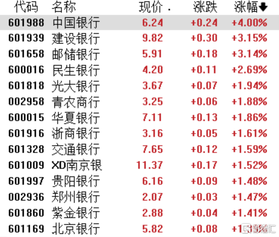 银行板块全线走强,中国银行、工商银行均续创历史新高,建设银行、邮储银行涨超3%,光大银行、浙商银行、交通银行、郑州银行跟涨。