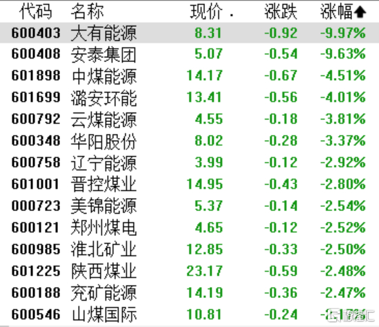 煤炭板块普跌,大有能源跌停,中煤能源、潞安环能跌超4%,云煤能源、华阳股份跌超3%。