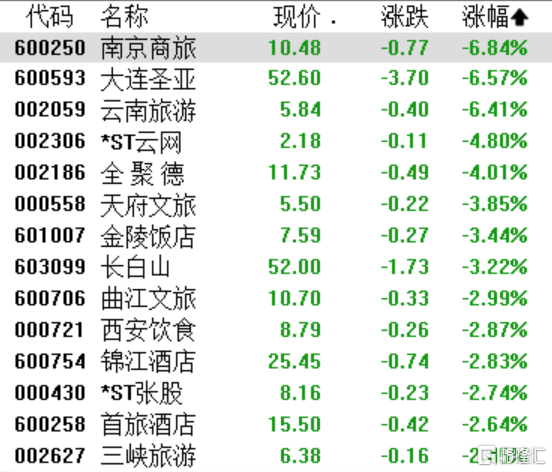 旅游股集体下跌,南京商旅、云南旅游、大连圣亚跌超6%,天府文旅、长白山跌超3%,曲江文旅、西安饮食、锦江酒店、三峡旅游跟跌。