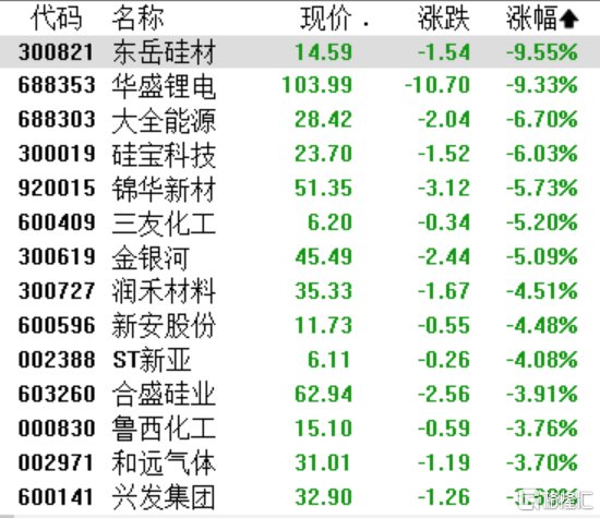 有机硅板块下挫,东岳硅材跌逾9%,大全能源、硅宝科技跌超6%,金银河、润禾材料、新安股份、合盛硅业纷纷下跌。
