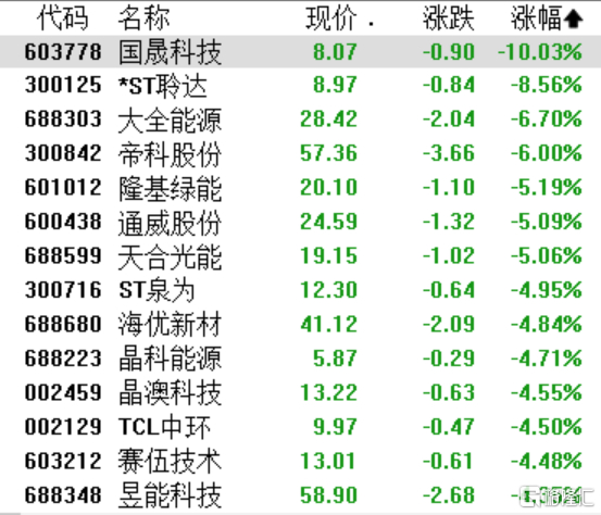 光伏设备板块震荡下行,国晟科技跌停,大全能源、帝科股份跌超6%,隆基绿能、通威股份、天合光能跌超5%。