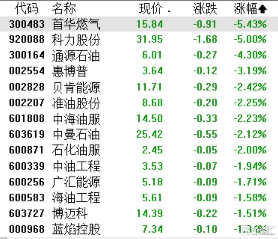 油气开采板块表现较弱,首华燃气跌超5%,通源石油跌超4%,贝肯能源、准油股份、中海油服、中曼石油跌超2%。