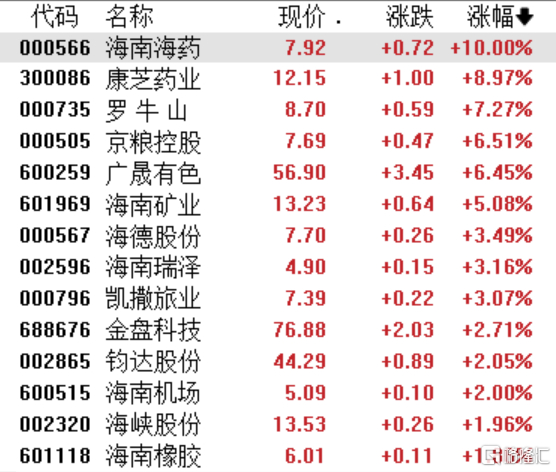 海南板块震荡走高,海南海药涨停封板,康芝药业涨近9%,海南矿业涨超5%,海德股份、海南瑞泽、凯撒旅业涨超3%。