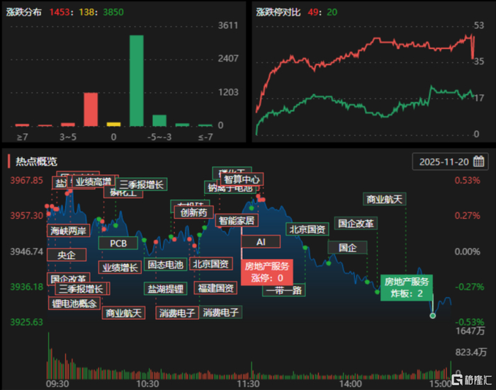 11月20日,A股三大指数集体下跌,沪指跌0.4%,深证成指跌0.76%,创业板指跌1.12%。全市场成交额1.72万亿元,较前一交易日缩量200亿元,全市场超3850只个股下跌。