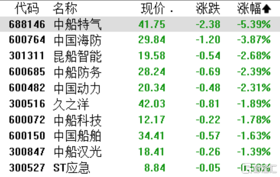 中船系全线飘绿,中船特气跌超5%,中国海防跌超3%,昆船智能、中船防务、中国动力跌超2%。