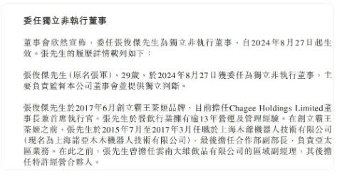 2024年8月27日,海底捞发布公告,从即日起委任29岁霸王茶姬创始人张俊杰为独立非执行董事,任期三年,年薪120万元。