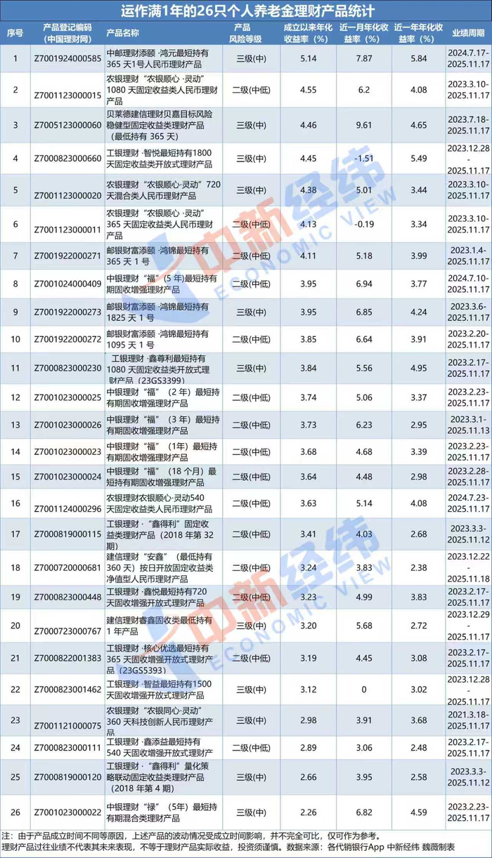 据各银行App披露的数据,截至11月17日,37只个人养老金理财产品成立以来的年化收益率均在2%以上。在26只投资运作满1年的产品中,8只理财产品近一年年化收益率在4%以上,其中中邮理财添颐·鸿元最短持有365天1号人民币理财产品和工银理财·智悦最短持有1800天固定收益类开放式理财产品近一年年化收益率均在5%以上,分别为5.84%、5.49%。