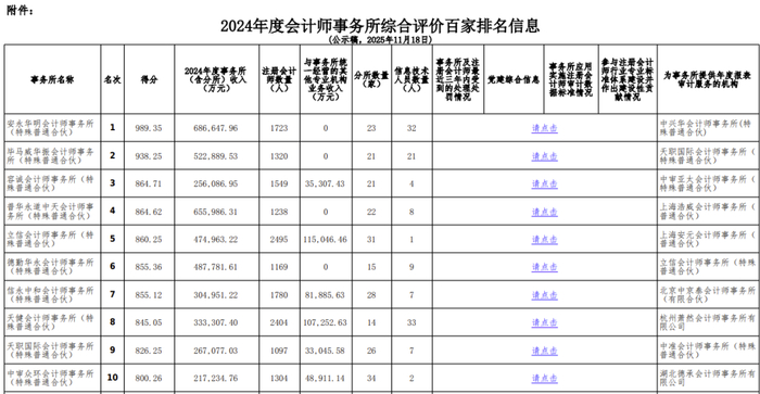11月18日,中国注册会计师协会发布《2024年度会计师事务所综合评价百家排名信息(公示稿)》,总共涵盖105家会计师事务所。这是2025年5月21日中注协对《会计师事务所综合评价排名办法》进行修订后,公布的首个百强榜排名。