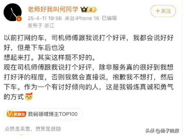 今年4月11日,何同学曾发博称:“以前打网约车,司机师傅跟我说打个好评,我都会说好好好,但是下车后也没想起来打。其实这样挺不好的。现在司机师傅跟我说打个好评,除非服务真的很好到我想打好评的程度,否则我就会直接说,抱歉我不想打,然后下车。作为一个有讨好倾向的人,这是我锻炼真诚和勇气的方式。”