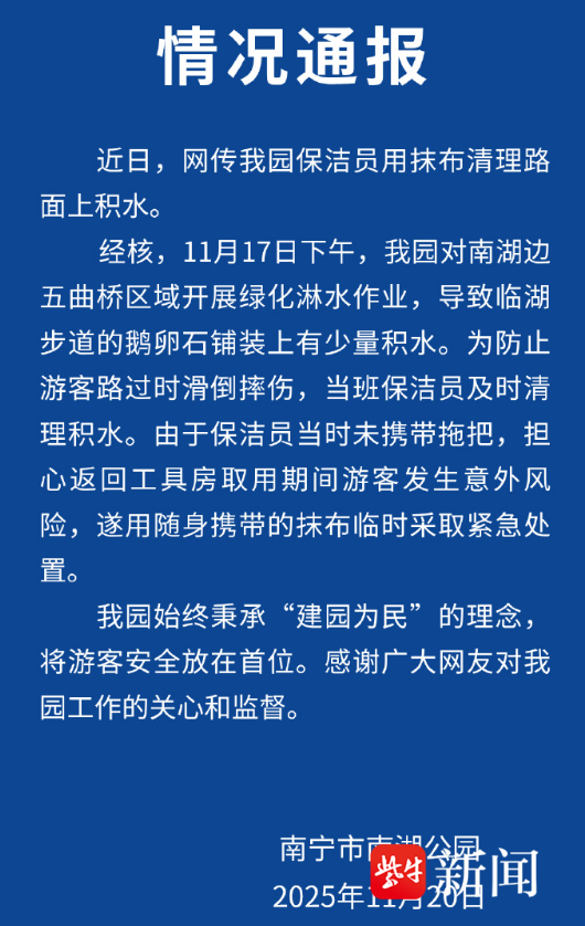 该视频发出后在网上引发热议,“这种景点只要没有烟头、垃圾袋和饮料瓶这类就行了,水渍和树叶都很正常,没必要这样。”有网友称,感觉有点水更有意境,贴近大自然。记者注意到,就在今天(11月20日),南宁南湖公园对此发布情况通报。通报称,近日,网传我园保洁员用抹布清理路面上积水。经核,11月17日下午,我园对南湖边五曲桥区域开展绿化淋水作业,导致临湖步道的鹅卵石铺装上有少量积水。为防止游客路过时滑倒摔伤,当班保洁员及时清理积水。