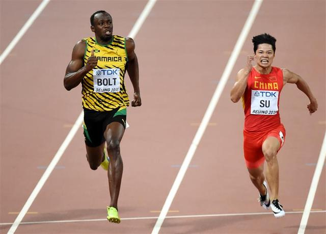 新华社照片,北京,2015年8月23日,牙买加选手博尔特(左)和中国选手苏炳添在比赛中。 当日,在北京国家体育场“鸟巢”进行的2015年国际田联世界田径锦标赛男子100米半决赛中,牙买加选手博尔特以9秒96的成绩晋级决赛。 新华社记者王昊飞摄