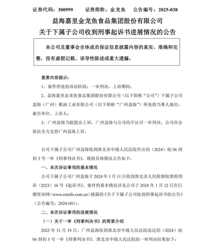 2025年11月19日晚间,益海嘉里金龙鱼食品集团股份有限公司发布关于下属子公司收到刑事起诉书进展情况的公告。公告显示,金龙鱼下属子公司益海(广州)粮油工业有限公司被刑事起诉迎来一审判决。