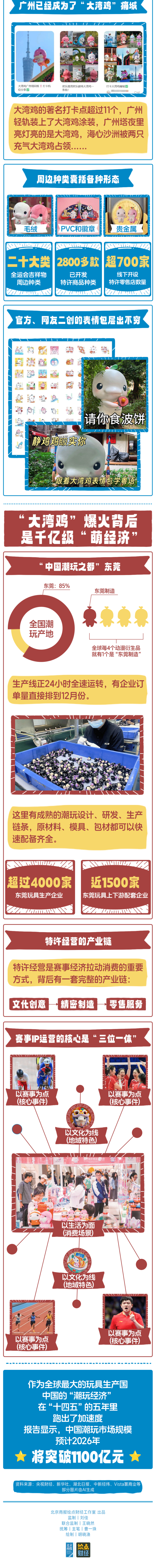近期,全运会吉祥物“喜洋洋”“乐融融”凭“大湾鸡”的可爱昵称火爆出圈!相关话题阅读量破30亿,限量周边1分钟秒空,特许商品销售额超6.8亿元。这两只爆火的“大湾鸡”背后是千亿级“萌经济”。