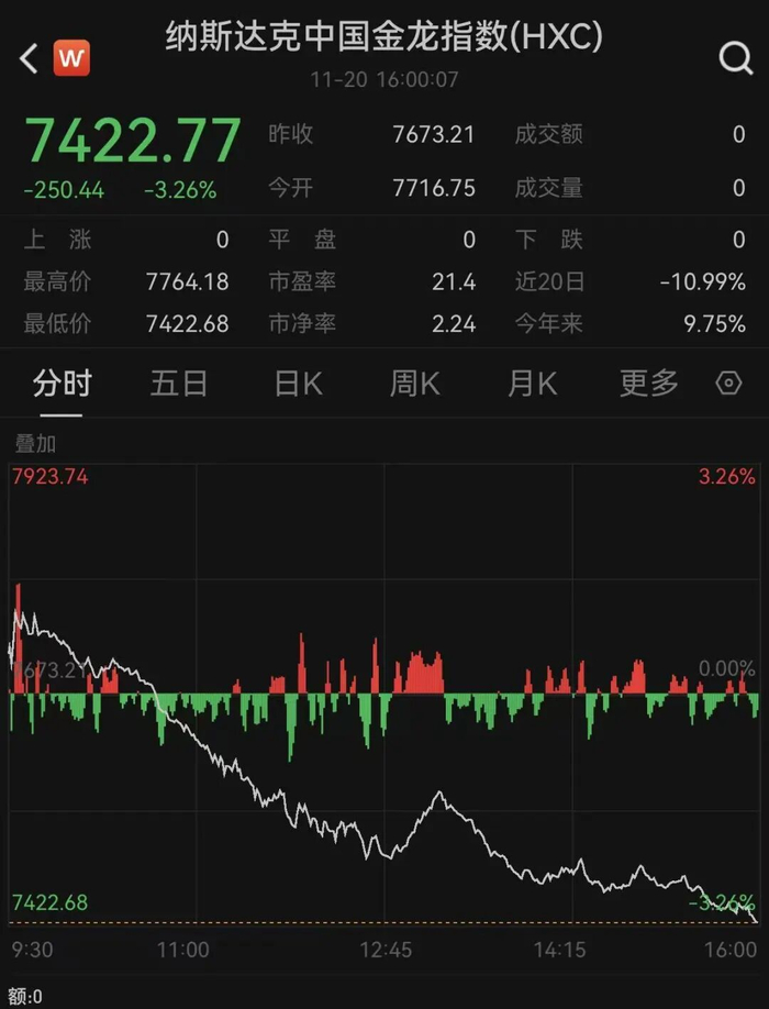 中概股普遍下跌,纳斯达克中国金龙指数跌3.26%,个股方面,阿特斯太阳能跌近19%,信也科技跌超14%。