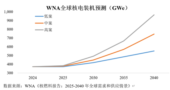 核能发电是铀最主要的销售渠道。从需求端来看,根据WNA数据,2024年全球反应堆天然铀需求量共计6.75万tU,较2021年上升8.00%。在全球能源清洁转型和核电加速建设发展的推动下,天然铀供需缺口预计长期存在。根据WNA预测,在参考情景(中案)中,到2040年,全球核电装机容量将达到746GWe,全球反应堆铀需求预计将增加至15.05万tU;在低案和高案情景中,到2040年,全球核电装机将分别达到552GWe和966GWe,全球反应堆铀需求将分别上升到10.73万tU和20.46万tU。