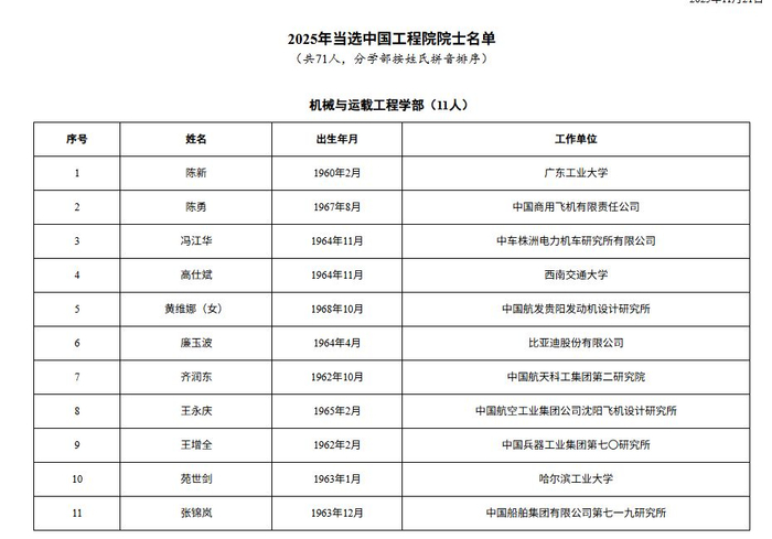 2025年共选举产生中国工程院院士71人。其中,机械与运载工程学部11人,信息与电子工程学部9人,化工、冶金与材料工程学部10人,能源与矿业工程学部12人,土木、水利与建筑工程学部7人,环境与轻纺工程学部6人,农业学部8人,医药卫生学部8人。此次中国工程院院士增选中,女性科学家有8人当选,还有一批国防和国家安全领域承担重大任务的专家、多位民营科技领军企业的专家以及6位扎根西部边远地区的优秀专家当选。本次增选后,中国工程院共有院士1002位。2025年新当选中国工程院外籍院士24人。本次选举后,中国工程院共有外籍院士148位。