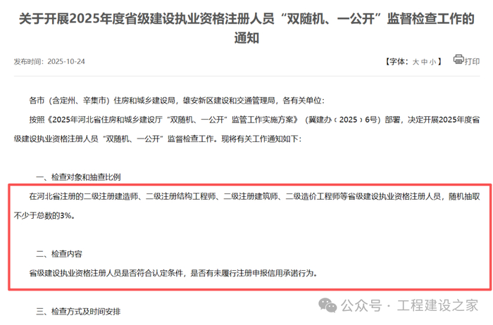 按照《2025年河北省住房和城乡建设厅“双随机、一公开”监管工作实施方案》(冀建办﹝2025﹞6号)部署,决定开展2025年度省级建设执业资格注册人员“双随机、一公开”监督检查工作。现将有关工作通知如下: