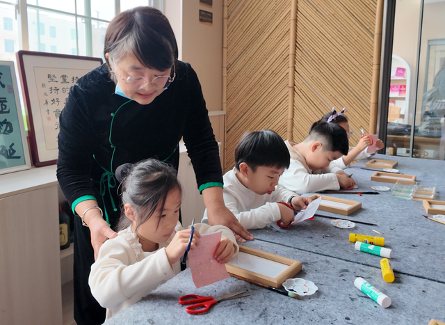 烟台龙口河北嘉元社区设立“指尖非遗匠心铺”,邀请“黄县窗染花”烟台市级非遗传承人孙述娟等老师组成教学团队,常态化开展非遗特色课程。记者到访时,孙老师正在教孩子们学习剪纸。