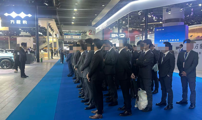早上8点刚过,比亚迪的销售人员就已经列队整齐,开始了动员工作。其中,服务态度、主动销售成为了站在前面的负责人强调最多的词语。几乎在同一时间,广汽昊铂的销售团队也在紧锣密鼓地召开“战前”会议,明确工作重点与分工。